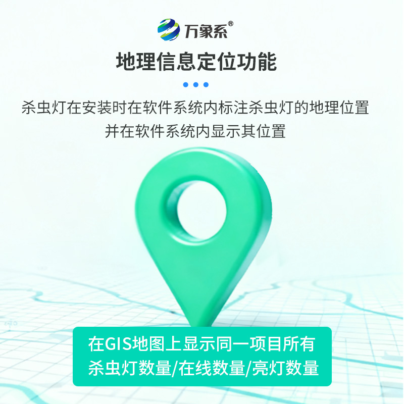 9.地理信息定位功能:殺蟲燈在安裝時在軟件系統內標注殺蟲燈的地理位置,并在軟件系統內顯示其位置。在GIS地圖上顯示同一項目所有殺蟲燈數量、在線數量、亮燈數量,方便管理。